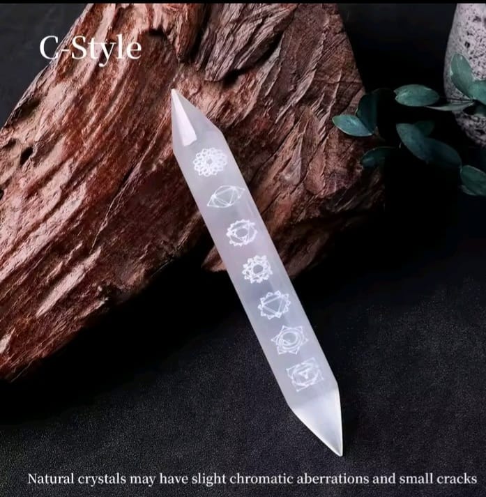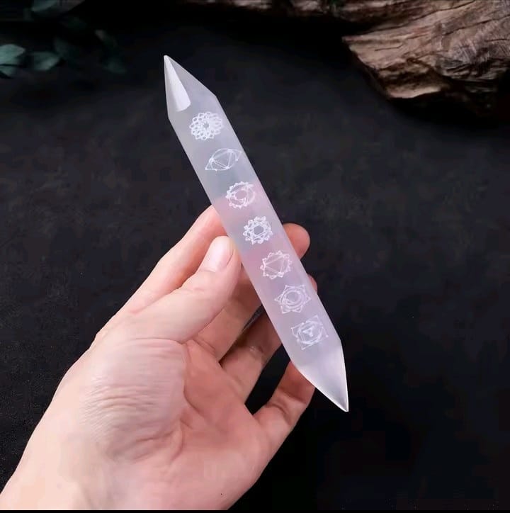 Ce magnifique bâton en sélénite marocaine naturelle est gravé des symboles des 7 chakras, chacun délicatement coloré pour représenter l'énergie correspondante.