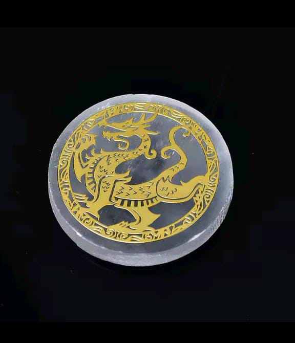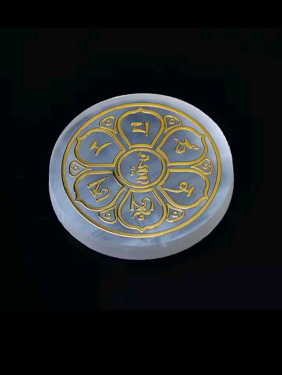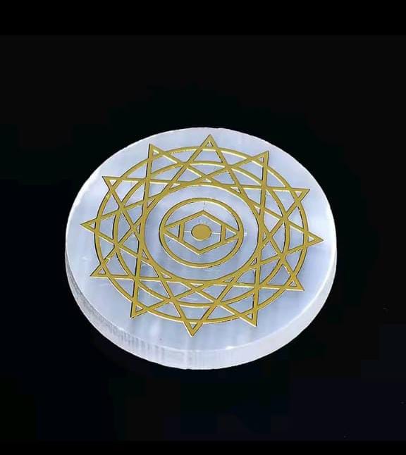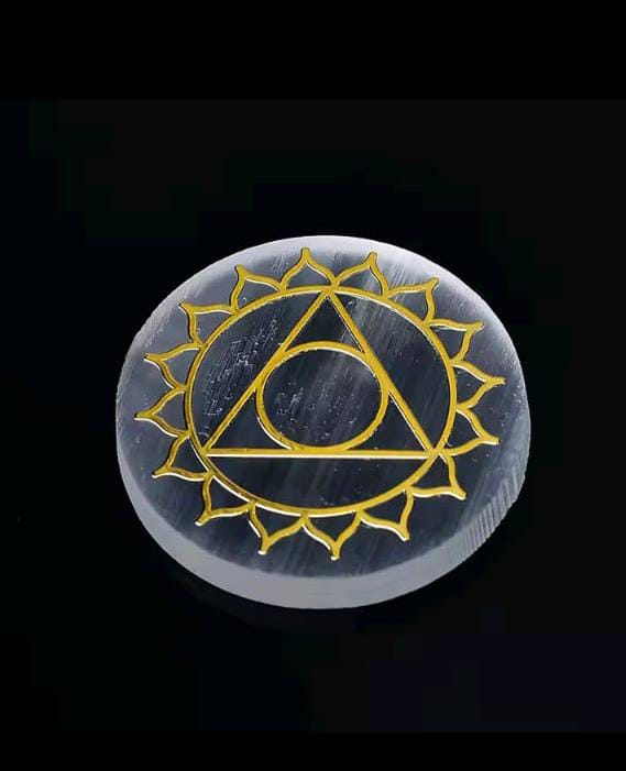 Disques en sélénite marocaine gravés – Symboles sacrés dorés